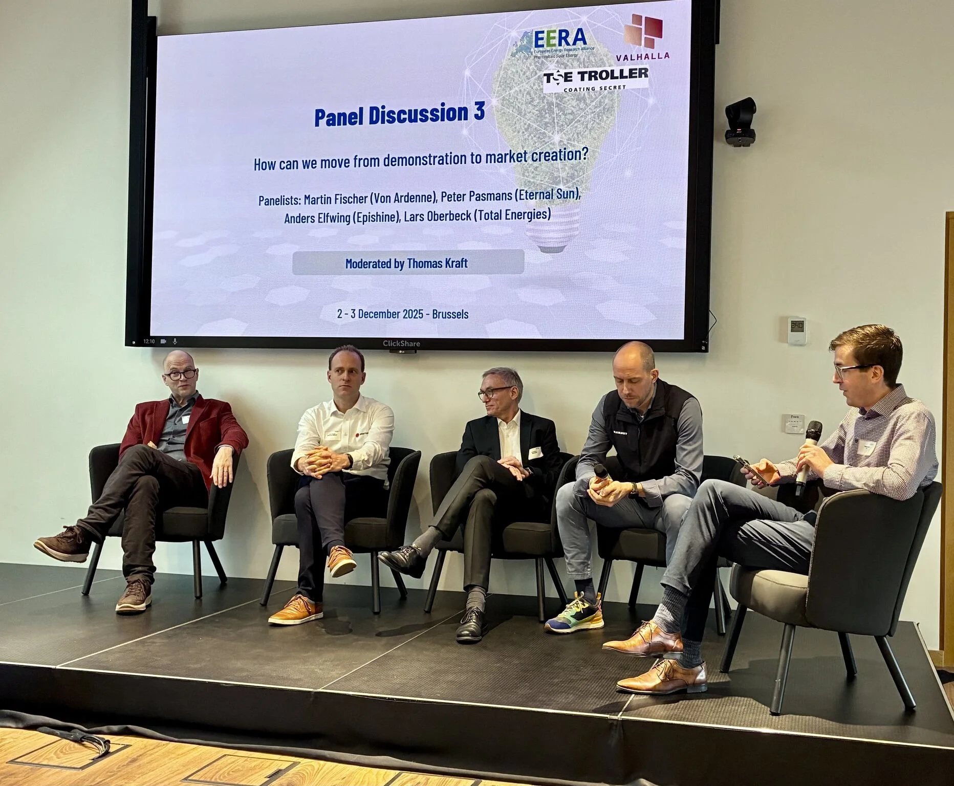 The PERSEUS project was represented by its coordinator, VTT, with Thomas Kraft chairing the panel discussion “How can we move from demonstration to market creation?”. The discussion addressed challenges related to scaling emerging PV technologies, industrial uptake, and the transition from research and demonstration to market deployment.